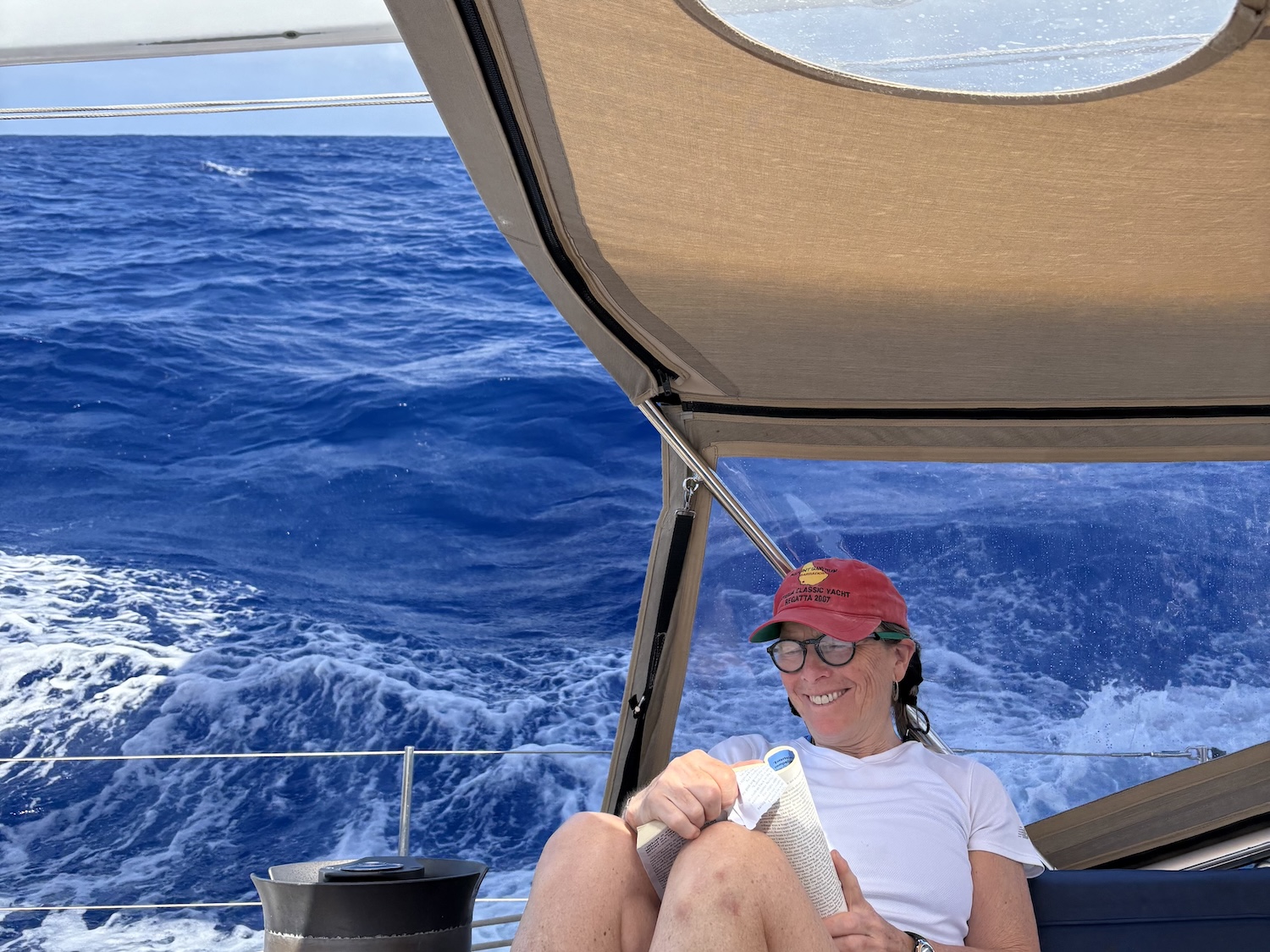 It’s HOT. And very humid. This equatorial sailing, nothing can prepare you for the heat! When you sleep, whatever side of your body that’s against the cushions and the sheet leaves a sweaty imprint. It’s like a crime scene outline, but in sweat. It’s gross.