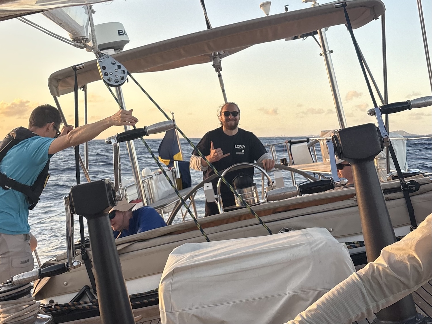 Approaching the 24 hour mark since slipping lines from Tahiti, I asked the self named ‘Spare Change’ watch for a sentence or two about their experience at sea so far. They are as follows: