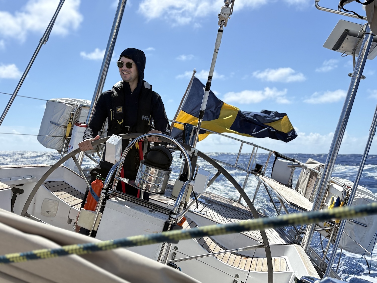 By Vilgot, Adrienne II Crew | Today is the 14th of October and the 14th day at sea the sky is starting to turn blue and small cloud banks cover the small parts of the blue ocean above us. The ocean beneath us has calmed down the last couple of days and the comforting waves rocks the boat while we make our way upwind towards our destination.