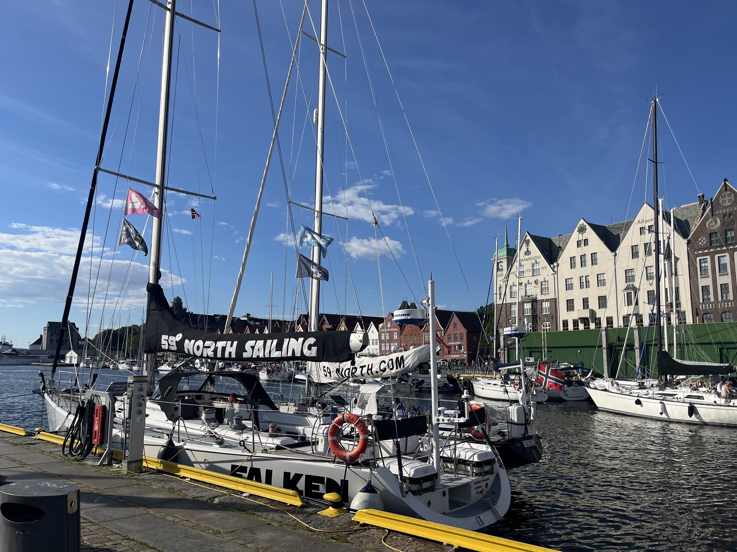 We arrived in the big city and found our mooring, which had been booked, was being used by another smaller boat. We just about managed to secure FALKEN with the bow sticking out. FALKEN really is very big. We forget how big she is when we are sailing. It’s only when we moor her that we are reminded. Her rig towers above most vessels. The vessel in question moved and we warped FALKEN back into her place. We were right in the heart of the old city of Bergen, near the beautiful old dock houses.