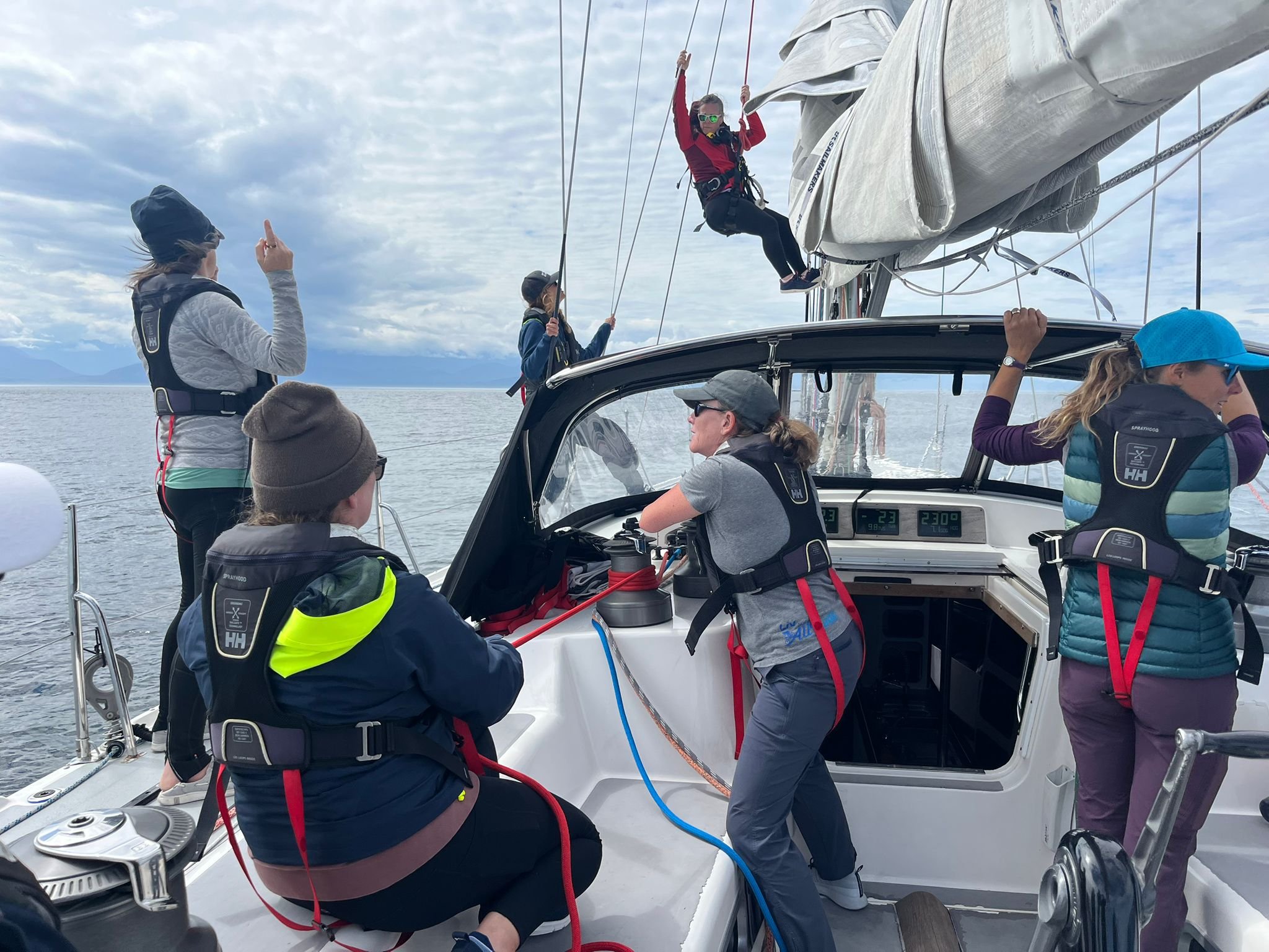 After a quick breakfast, we left the dock at nine to head over to the fuel dock before slipping lines and leaving Victoria behind us. The wind is not due to fill in for a day or two, so we spent the first day motoring to an anchorage 50 nm up the coast. A day of motoring can sound boring and stale, but it was a day full of briefings. The crew learned how to safely operate the winches in the cockpit, and the final test was to get Angela up the mast (a few meters) to attach the main halyard. Yes, they passed the test and Angela came down safely.
