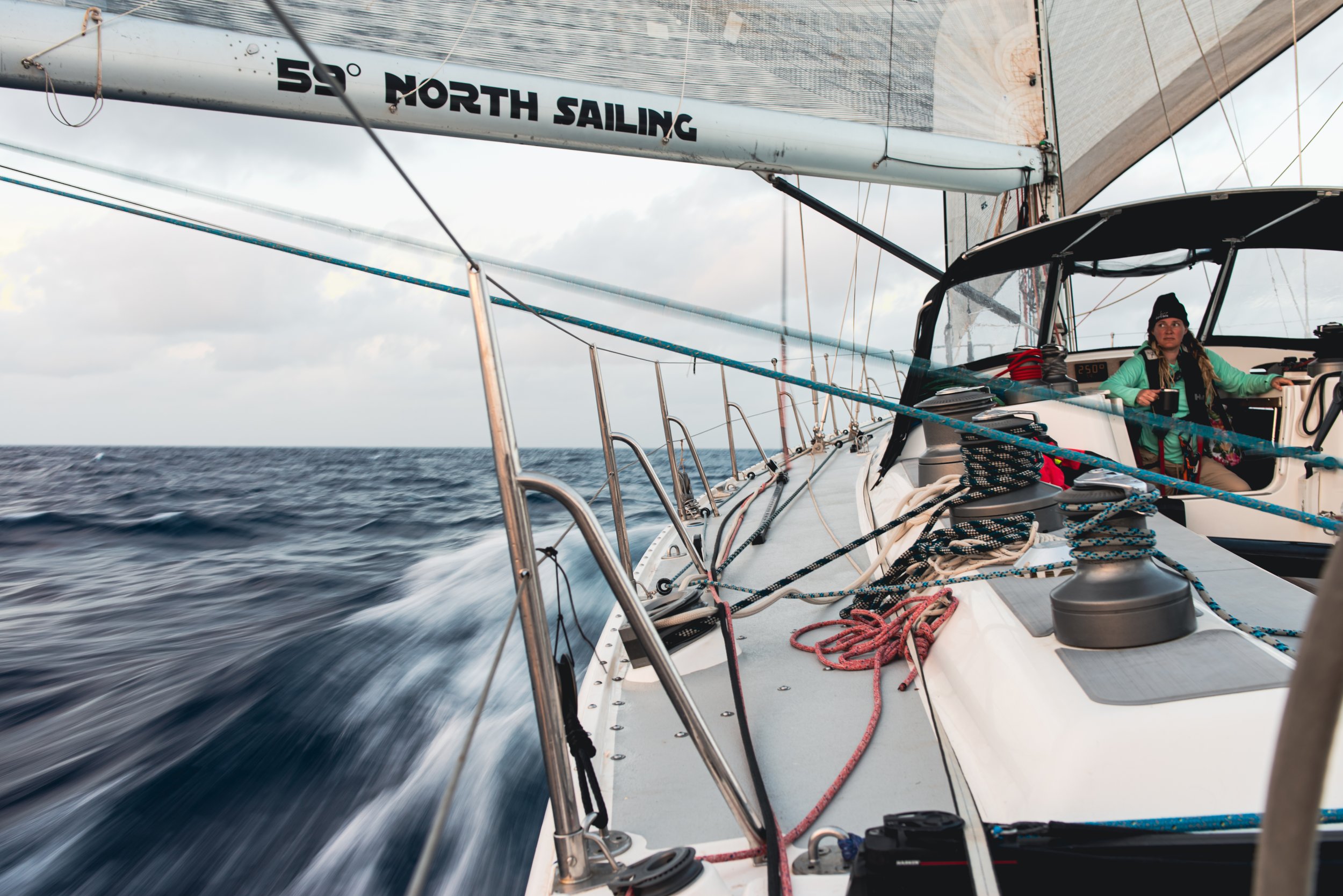 The wind picked up yesterday from the southwest, and we have since been sailing wing on wing on a fairly deep course of 150 degrees to the apparent wind. As the swell picked up progressively from behind, helming became more and more challenging for the crew, some of whom have never sailed in such conditions. Over the span of 24 hours, the improvement is remarkable—the learning curve is steep. We could say we have gone from “steering the boat left and right” to “trimming the rudder for waves and gusts.” In the meantime, we have gone back to “flying” mode, covering 213 nm in the last 24 hours without even trying. It feels like it would be difficult to do less. In a few more hours, we’ll be past the halfway point, 600 nm in.