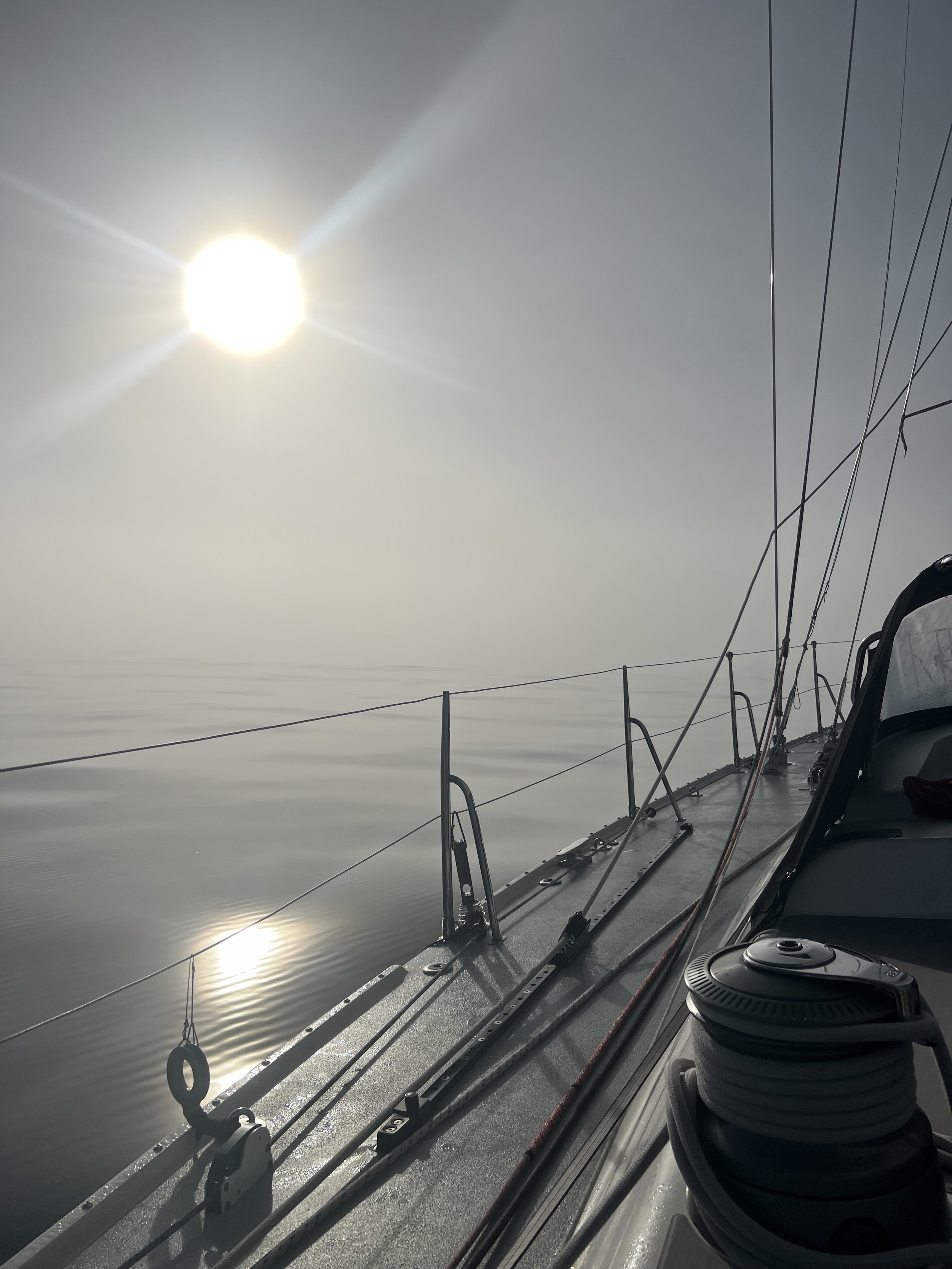 The seas have calmed down a lot from last night, giving us a much more comfortable ride as we head east on a starboard tack. A couple of hours ago we encountered a pod of 20-25 dolphins leaping from the sea at right angles to us; they passed under the keel and went off towards the open ocean. Spirits on watch are high, as most of us managed to get a decent chunk of sleep despite pounding waves earlier in the morning. Cirrostratus clouds are shielding us from direct sun while letting in lots of light and flashes of arctic blue sky. No traffic lately besides the dolphins and a curious petrel. Hopes are high that in the next day or so we can try some down-wind sailing, weather permitting. Many of us are using the calmer weather to practice our photography, and plans are already being made for a round of fancy margaritas in Ensenada.