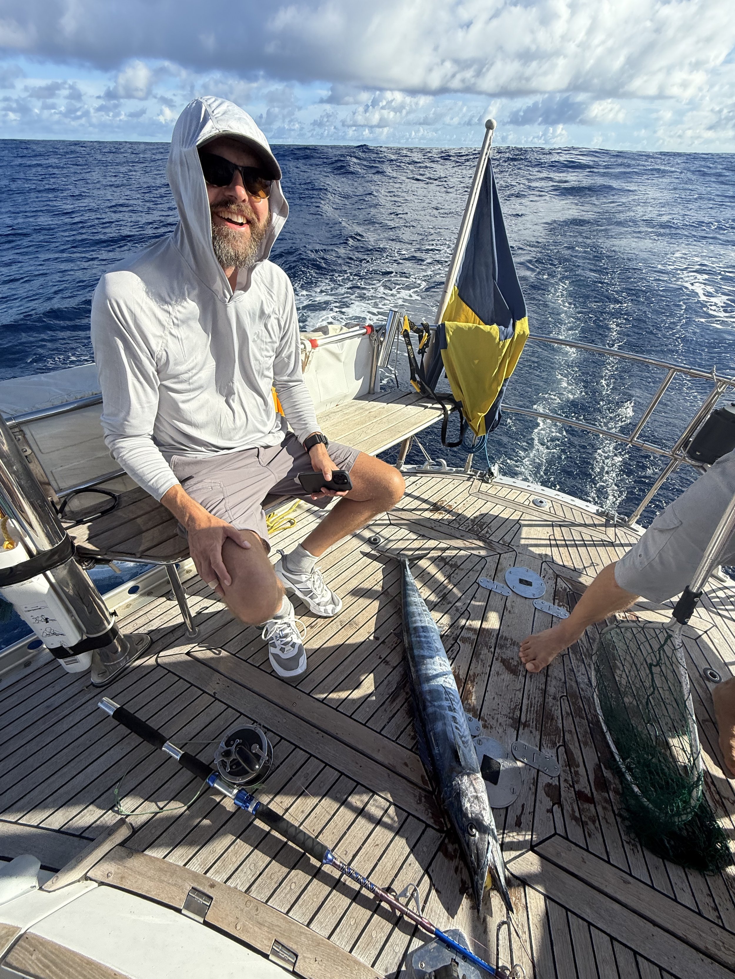 PPS. From David, this was the best day ever! We celebrated our halfway mark for this passage together in the forward cockpit eating the sashimi fish. Just as we did, a rain squall blew over us, and left us with beautiful pink sunset clouds. Tears in eyes.