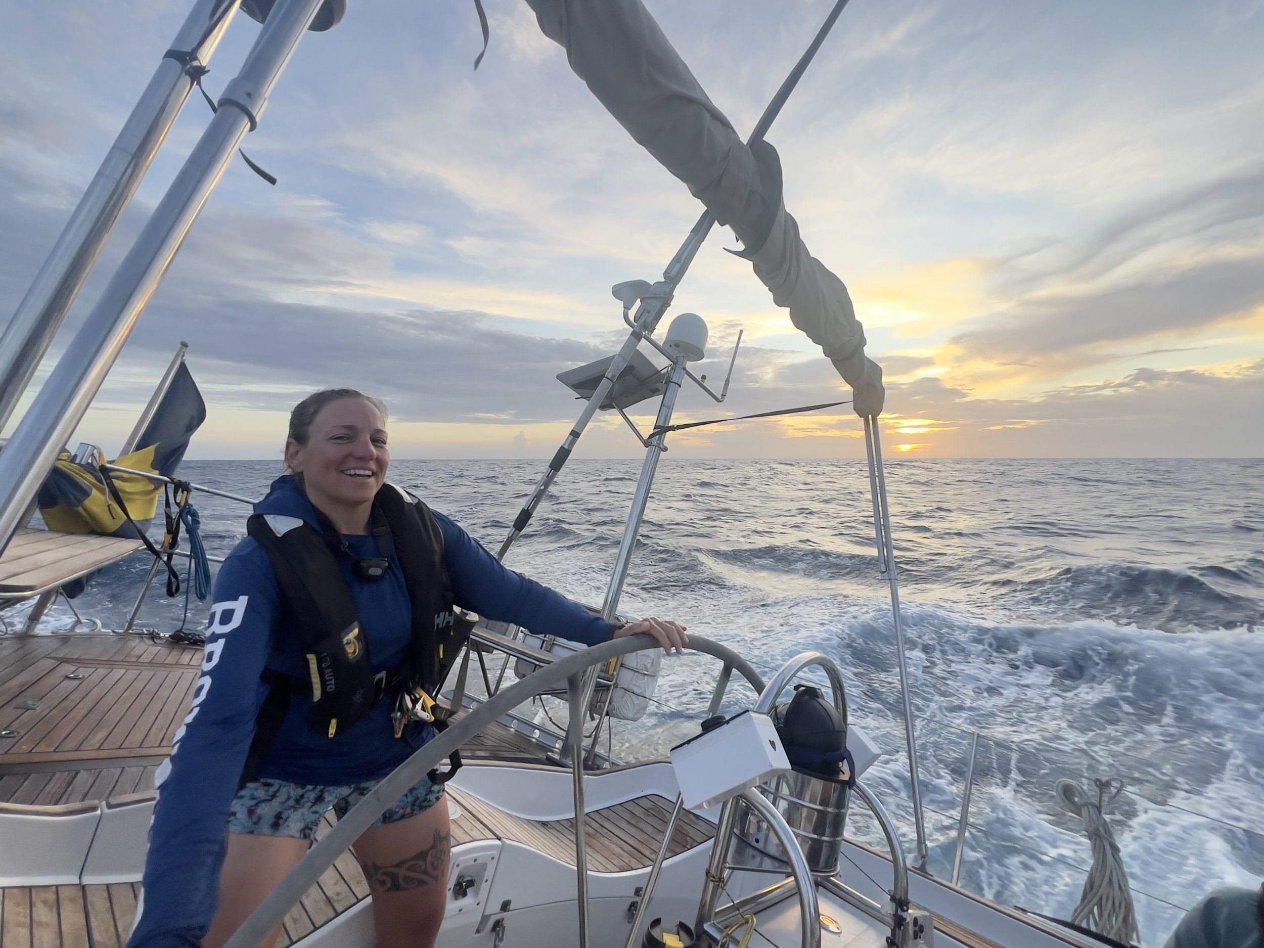 We got a nice morning shower when a cute rain cloud flew by, continued by oven pancakes made by Lance, and ended our morning shift with seeing some whale spouts in the distance. During the day, headwinds picked up and at one point a squall hit us (for the first time?), which made us put in a second reef in the main. Everyone was just happy to get some action after the calm days. Morale onboard was further boosted when Vilgot the legend made fish tacos for dinner from the Wahoo we caught yesterday. Many cheers all around!