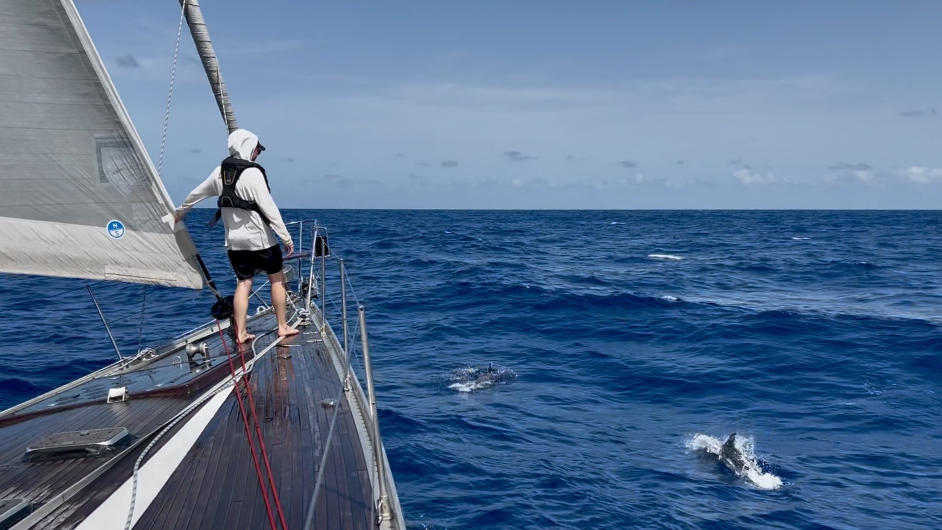 At 19 degrees north, the temperature has finally dropped. Cool evenings mean light jackets and much more comfortable sleeping. The biggest treat today was a pod of dolphins that swam with us for 20 minutes! They showed up on the port side and then swam several circles around Adrienne. Everyone woke up or stopped what they were doing to enjoy the visit. The pod was clearly having a blast swimming with Adrienne and seemed to enjoy hearing the crew’s whoops and cheers when they porpoised out of the water.