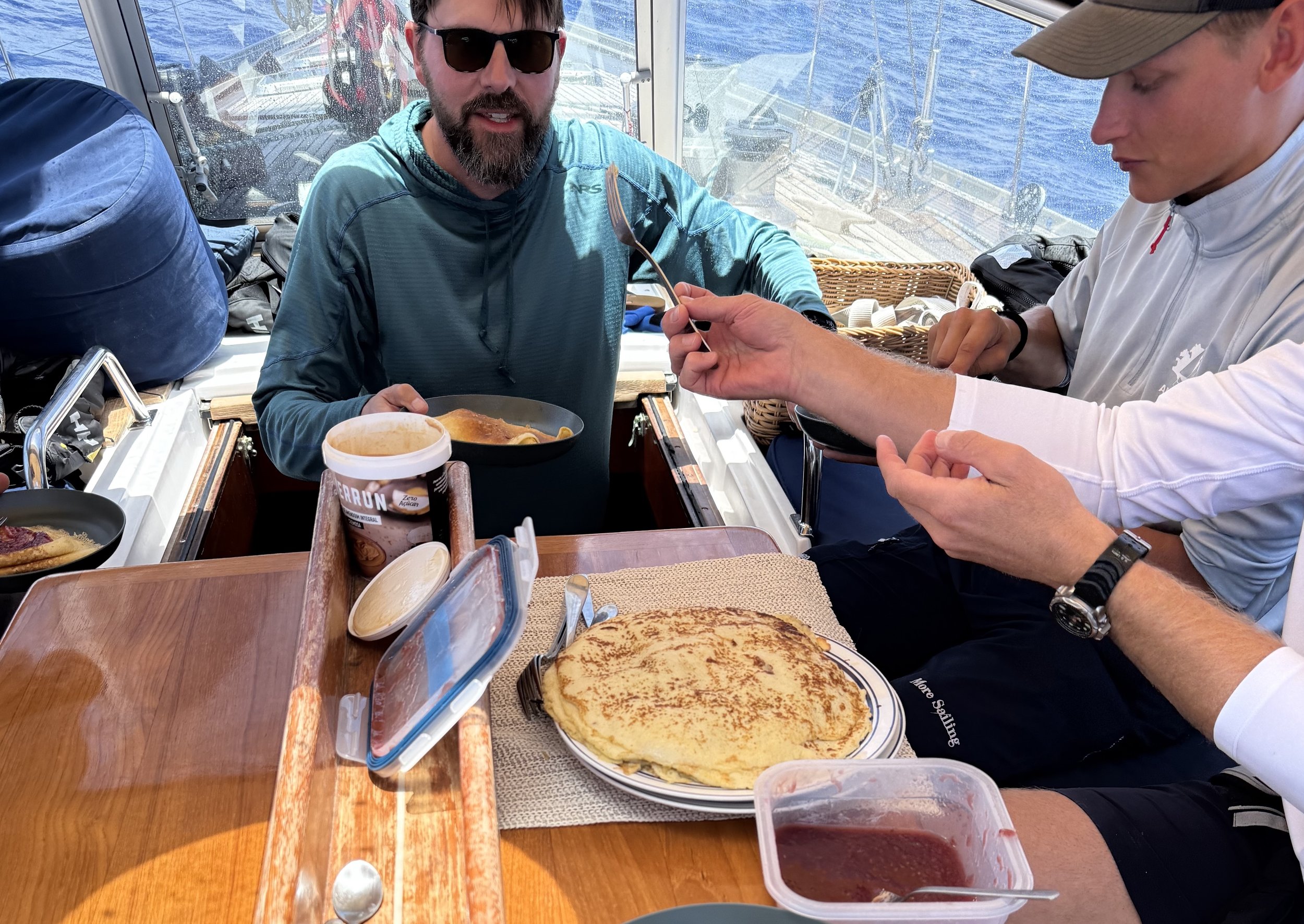 This blog is an ode to my colleague and shipmate Vilgot. This superb young man has just spent the summer skippering charter boats in Croatia, back-to-back weeks with guests onboard, sleeping on a sail bag whenever there was a break. That and his many other experiences truly make him a delight to be sailing with. Today he whipped up and fried some pancakes for lunch, much to the crew’s delight. With jam and Nutella on top, there wasn’t a happier boat in sight.