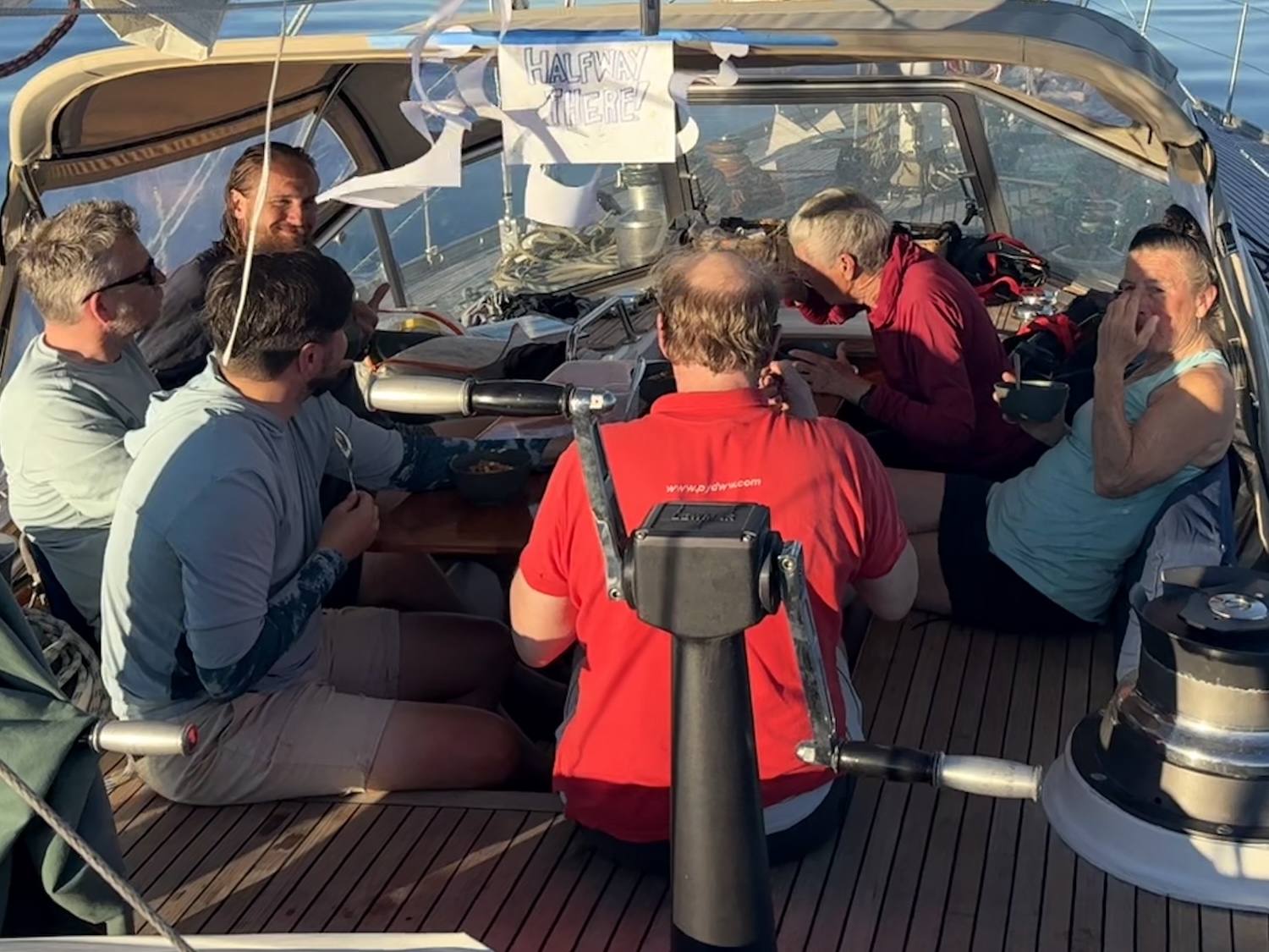 Although we are all out here to sail, and ideally sail fast, sometimes these days of calm motoring provide a much needed respite on long voyages. After beating up wind for over a week, we have a chance to mix up the routine, slow down, and relax a bit. We all now look forward to some more upwind sailing tomorrow afternoon (potentially on a port tack this time) and keep our fingers crossed for some reaching in our future.