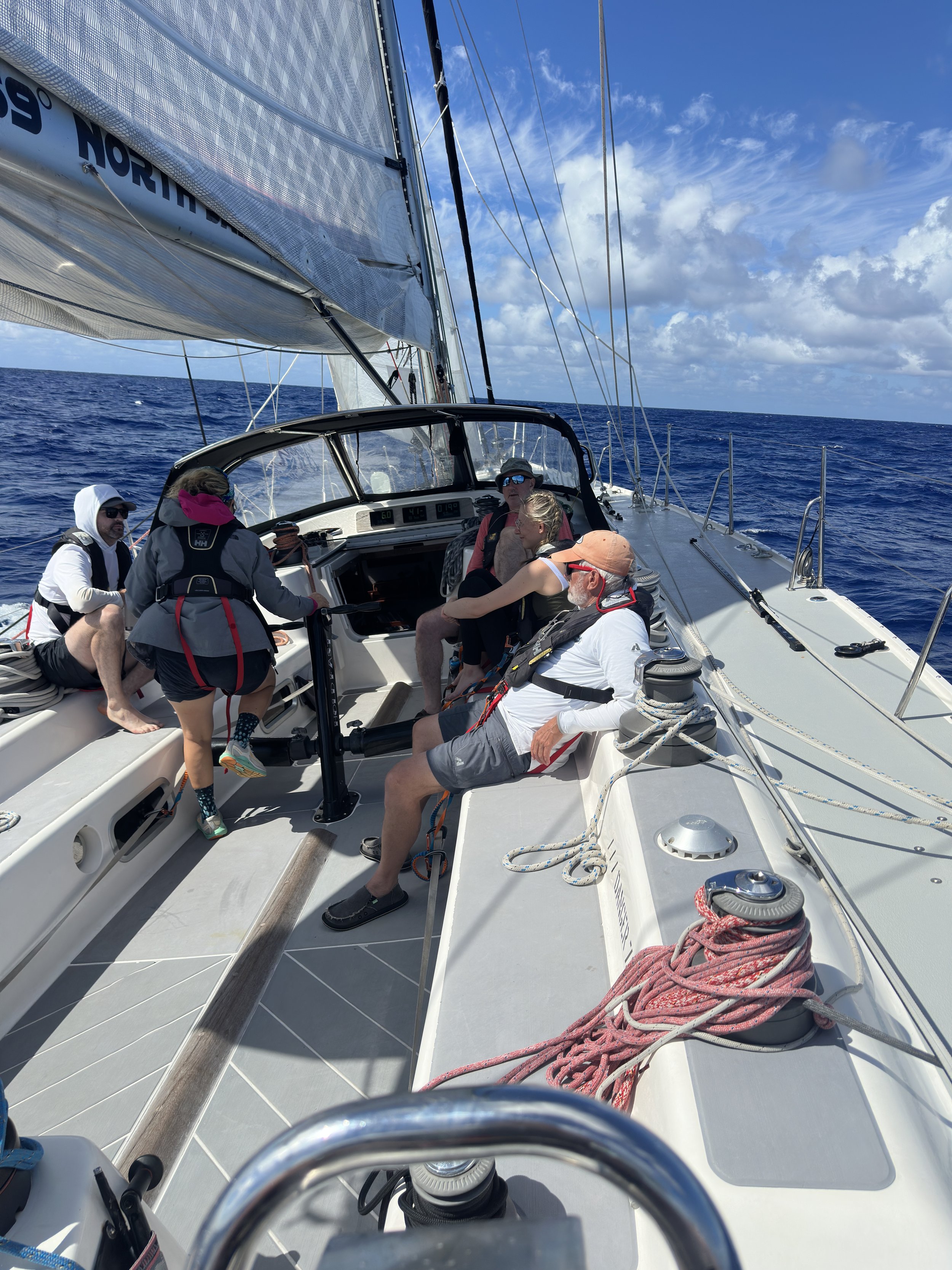 Steph and Ken, by far the most novice sailors on this trip, notched their first offshore overnight—though not without suffering a bit (maybe more than a bit in Steph’s case) of what we’ll just call “Neptune’s Revenge.” Despite that, we both bounced back quickly, and Steph, as we speak, is capably steering her first rotation at the helm.