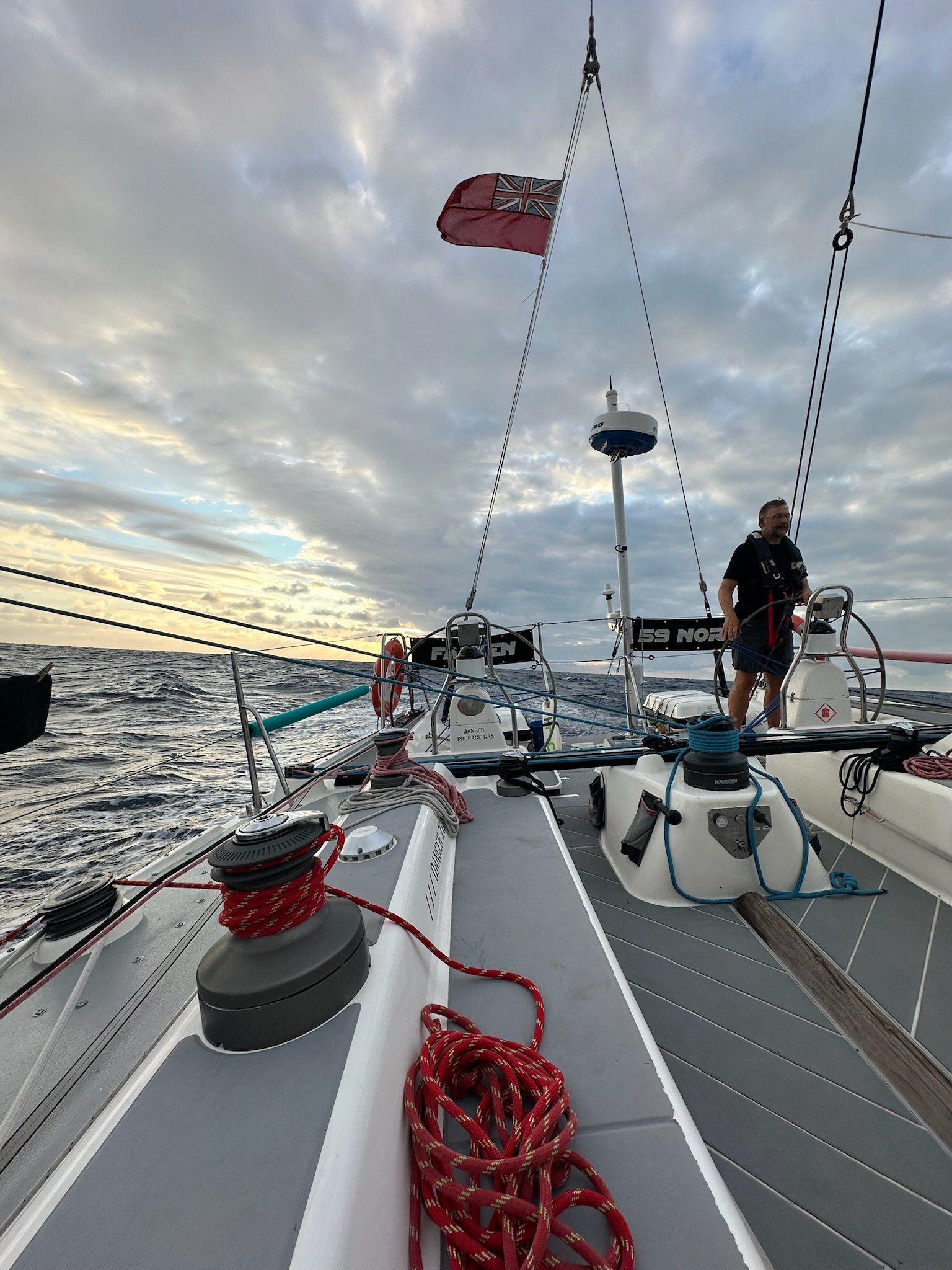 It hasn’t been this way in recent days, as we motored through the doldrums, in clouds and occasional rain while putting up with confused winds that added nothing to our progress or our comfort (hot and humid, and unable to open hatches for ventilation). Last night on midnight watch, the significant rain had me in full fowlies and my Dubarrys. Perhaps personally over canvassed, at about 00:50, the winds came, and all at once. Two minutes later it was 18 kts on the beam, the rain was gone, the motor went off, and we were back in business at about 00:52. Open the vents in the rain gear, and hold on tight—it’s going to get bumpy. We found the trade winds.
