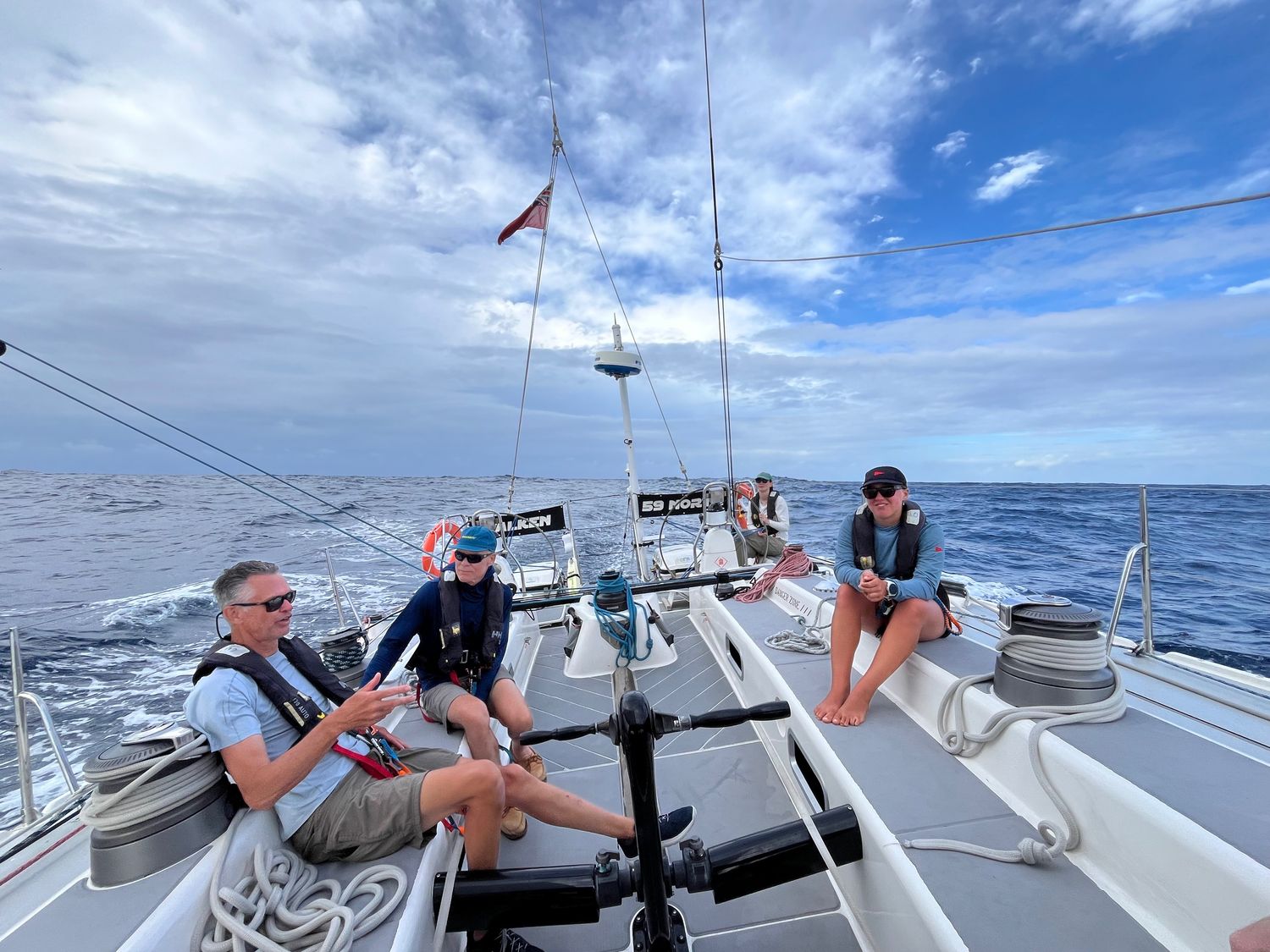 The quality of the 59° North Staff can’t be overstated. Turning a group of strangers into a functioning crew in a day is a big challenge… and they have succeeded. We are on watch groups of 3, with 3 hours on and 6 hours off, which gives us the opportunity to experience helming every hour of the day over the journey. More importantly we are all leaning on each other and everyone is eager to lend a hand, whenever.