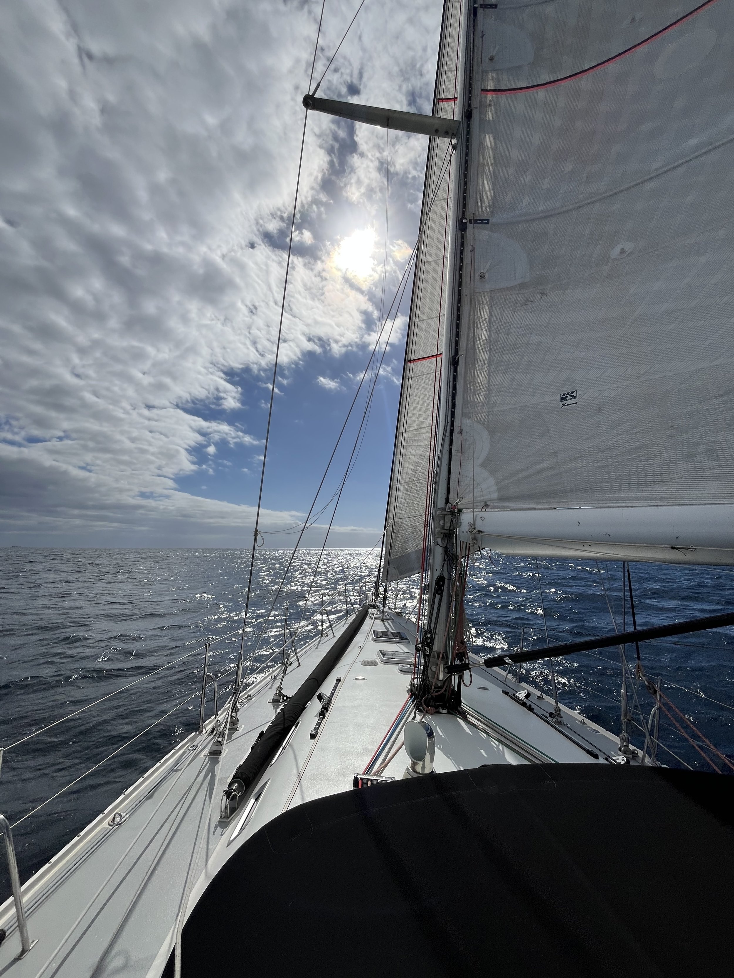 Well, well, well… Who could’ve foreseen that the most uncertain part of this trip would be the 300nm to landfall? In a way that was forecast by the GRIB models we’ve been downloading underway, it does look like the SE trades are taking a holiday for the remainder of the week, and it’s forced us to get a little creative aboard FALKEN. We’re currently reaching north to try and take advantage of some slightly friendlier current, as well as generate a little apparent wind.