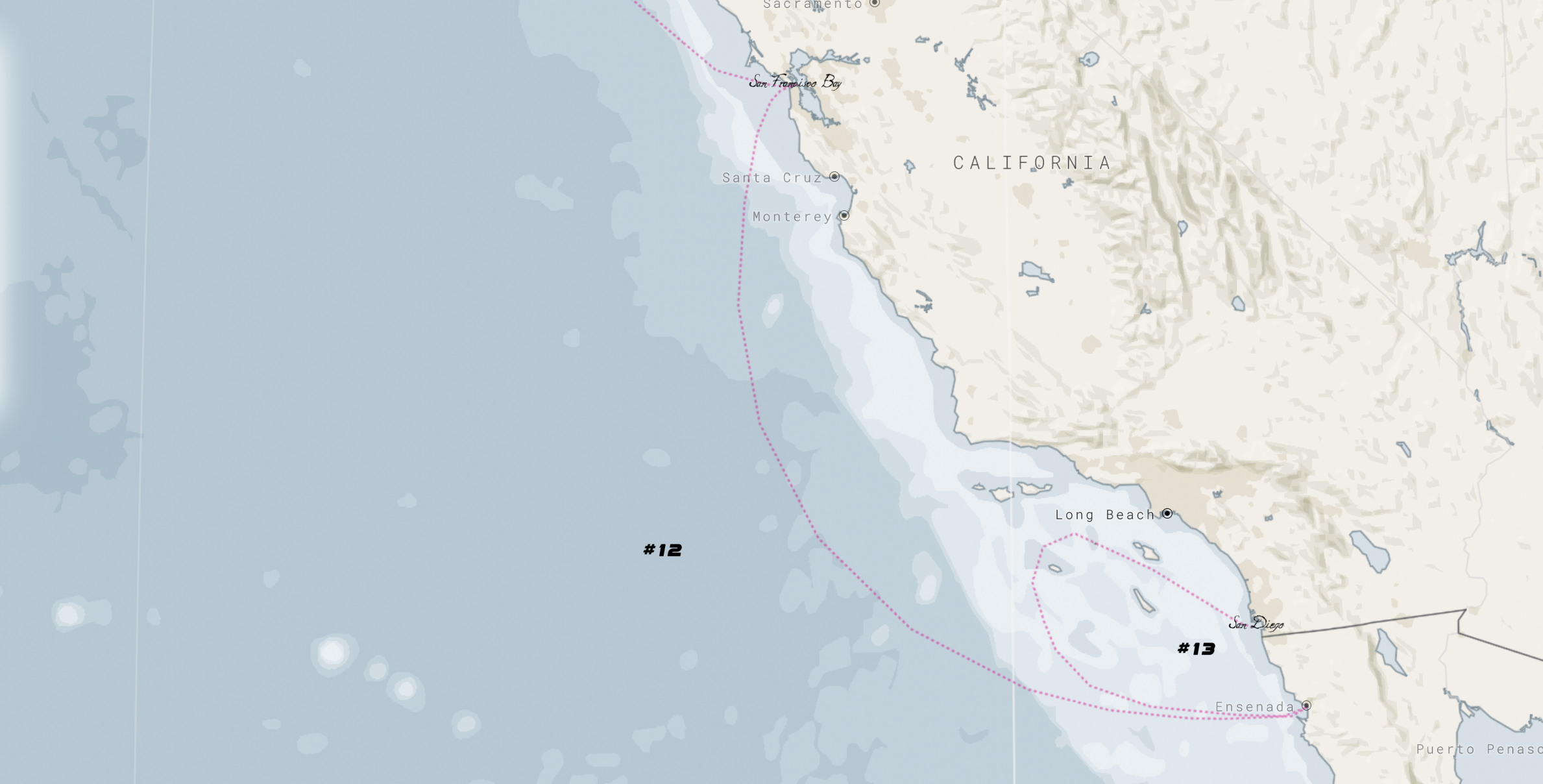 Prevailing winds expected NW to NNW, 12–22 kt, with moderate confidence; occasional periods of lighter winds possible nearshore, especially south of Point Conception. Offshore, wind strength may increase to 20–28 kt, particularly in the vicinity of coastal headlands and during frontal passages. Sea state generally moderate, 1.5–2.5 m (5–8 ft) offshore, with locally higher wind waves north of Point Conception; nearshore, seas 1–2 m (3–6 ft), with some lee effects south of the Channel Islands. Sea surface temperatures likely to trend from 56–60ºF (13–16ºC) in northern segments, rising to 62–68ºF (17–20ºC) approaching southern latitudes. Air temperatures expected cool to mild, 54–64ºF (12–18ºC) north, warming to 60–72ºF (16–22ºC) southward, with some diurnal variation and potential for coastal fog, especially overnight and nearshore. Moderate chance of a weak frontal system or trough affecting the northern half of the route, bringing increased cloud cover, wind shifts, and a brief period of unsettled conditions; otherwise, high pressure likely to dominate, supporting stable weather. Confidence moderate to high for prevailing pattern, with some uncertainty regarding timing and strength of any transient systems. This output is AI-generated, based on publicly available meteorological data and is meant to give a high-level overview of expected conditions. Professional forecasting & consulting with our weather-routing partners WRI will be used during the actual passage.