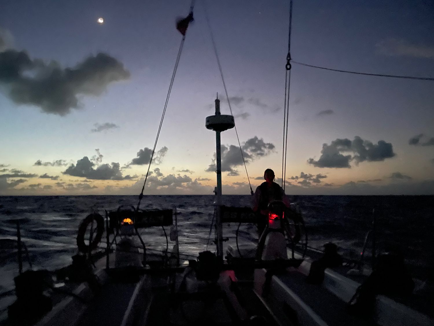 We had an amazing night with a sky filled of stars, except for a short lived rain cloud that came over us earlier in the night. We had Scorpio behind us with Libra above, while Orion was setting just behind the jib.